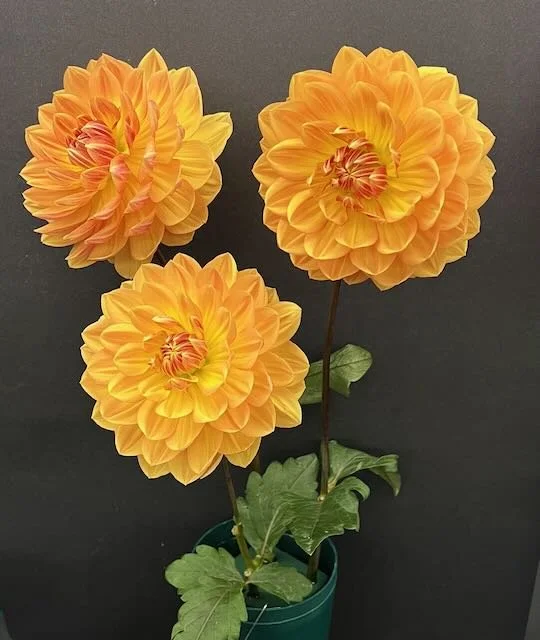 Hollyhill Golden Glow - (Waterlily). Hybridized by Ted and Margaret Kennedy. Blooms exhibited at the 2025 NEDS Dahlia Show by E.C.